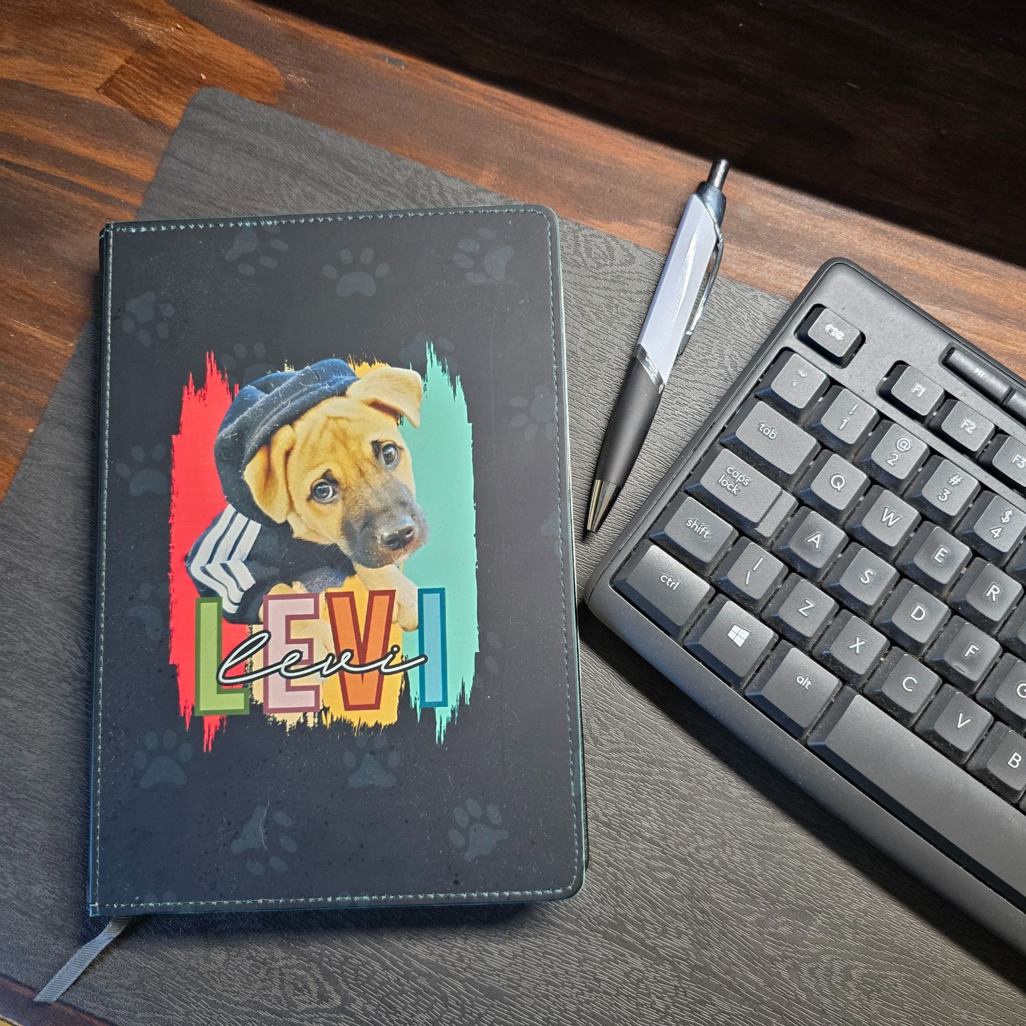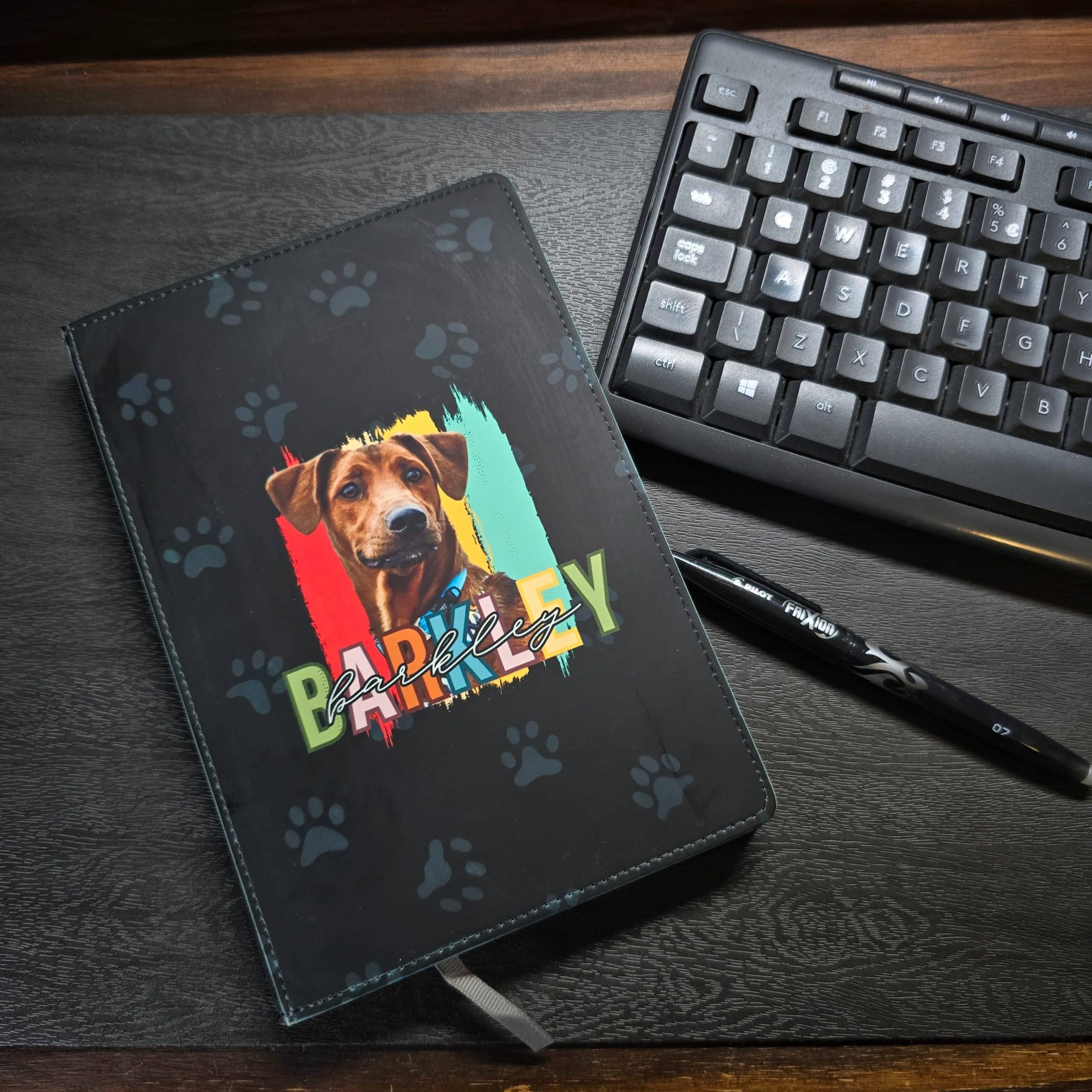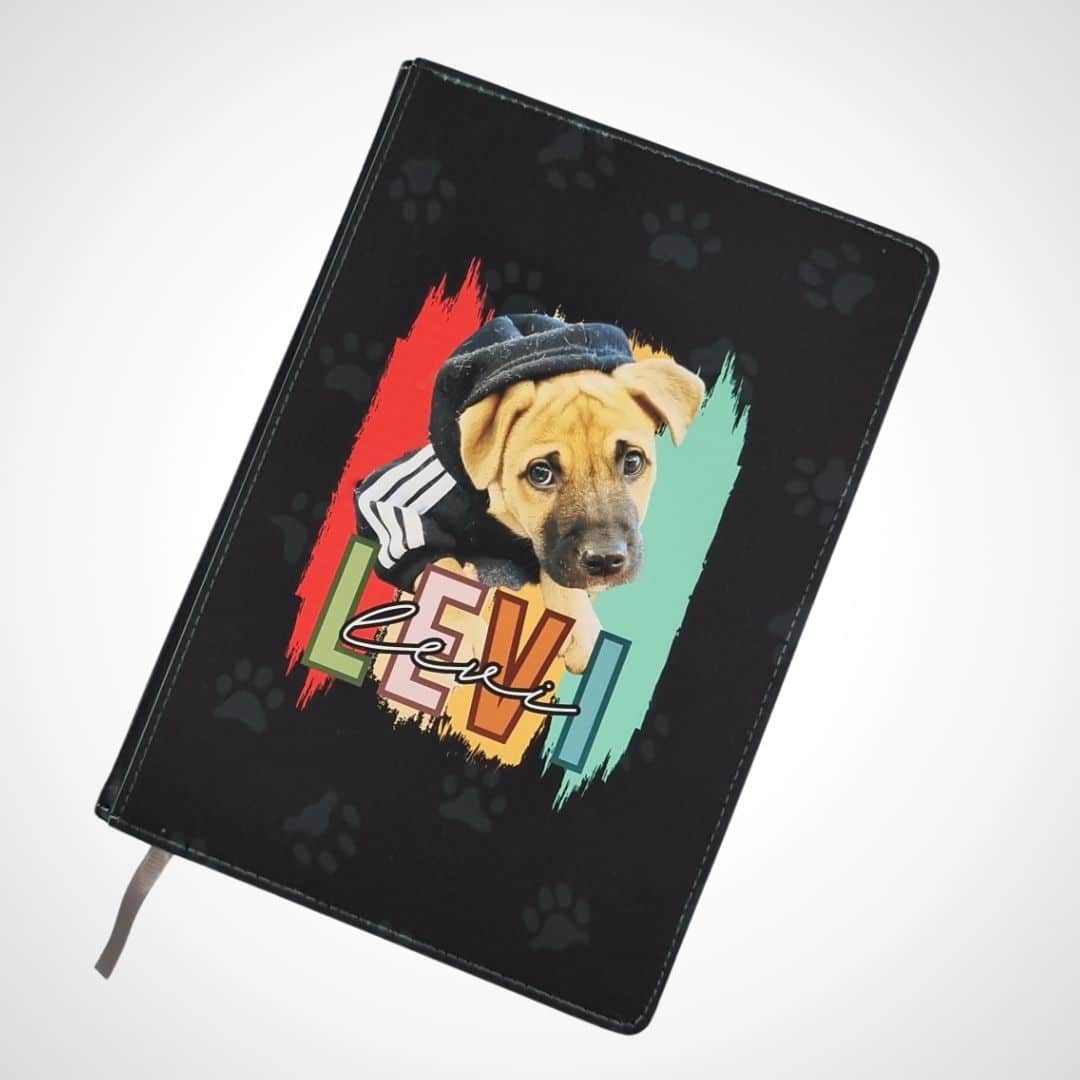 Every dog lover needs this personalised A5 notebook! Keep your furry friend close to your heart and add some fun to your work with our beautiful, high-quality notebook. Each notebook features your dog’s name and image on a vivid, fun background, making it the perfect notebook for any dog lover.